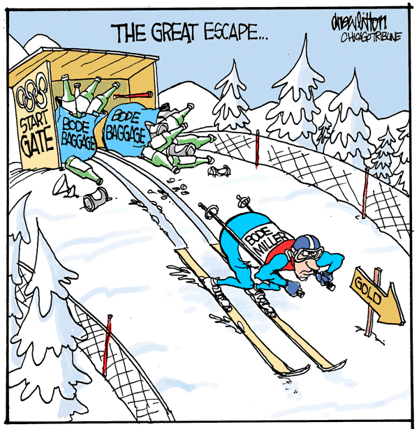 Bode Miller came back from the edge of oblivion on Sunday to capture an elusive Gold medal, his third medal of the 2010 games. Known in the past as someone who would rather party than win, Miller has become one of the feel good stories of these Olympics. This cartoon is from the Chicago Tribune and is one of quite a few I’ve been doing for them during the games. The editor there is a joy to work with and makes these cartoons a blast for me. So if you’ve been wondering why some days the cartoons are square (Tribune), sometimes horizontal (United Features) and really horizontal other times (9News), it’s because of all the different places I’m drawing for.