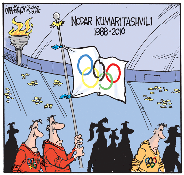 What a horrible way to start the games. Word has it that many people complained about the luge track being too fast. Three crashes on Friday, one ending in the tragic loss of a young promising athlete. There will be more on this story but I wanted to share this cartoon from Saturdays Chicago Tribune.