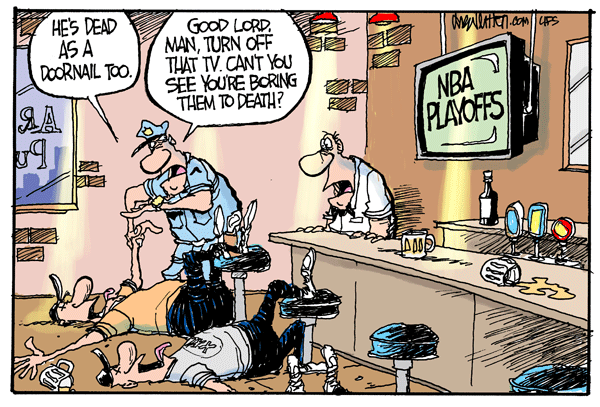 This one kind of sums up the NBA playoffs for me, especially this year. I guess I should be rooting for the Celtics-Lakers series to come through. I have several friends who are die hard Celtics fans. Yet I still feel lulled to sleep by it all. And to think…this is the warm-up for World Cup Soccer. Yikes!