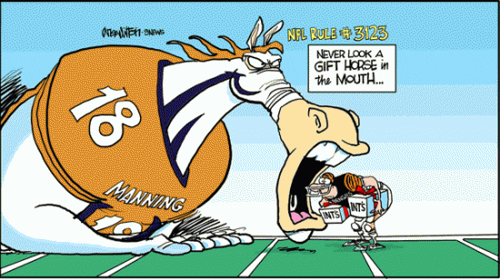It appears that Peyton has the same clay feet of most players in the NFL- trying to hard, pressing his luck. The good news the team stepped up and played well to win the game in Cincinnati- yes its the bengals but in the NFL you take the win, get back on the plane and promise to do better next week.