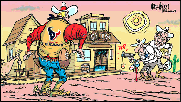Great cartoon. The ONLY thing that could have made it better would have been if the Texan figure was Gary Kubiak and the guy defending Jerry Jones was Wade Phillips.