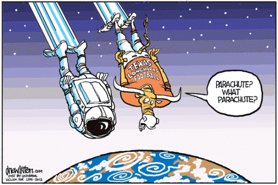 Quite the weekend. Felix Baumgartner jumps from 25 miles above the earth and The Texas Longhorns fall from 25 miles above the earth. For Felix, things turned out pretty well. For Bevo, not so much.