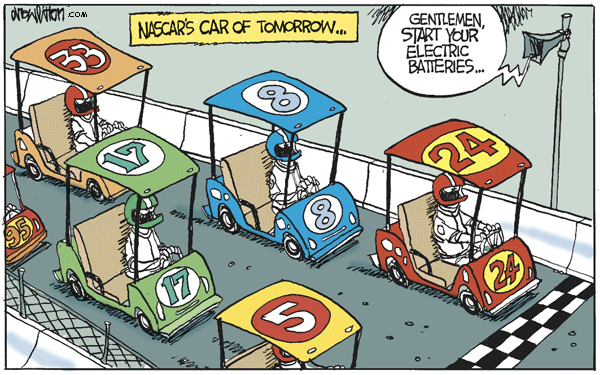 the roar of the engines- replaced by the whine of the batteries? NASCAR, if they were to follow through on your vision, could be a real proving ground for the engineers of the “new” generation of automobiles. Or not.