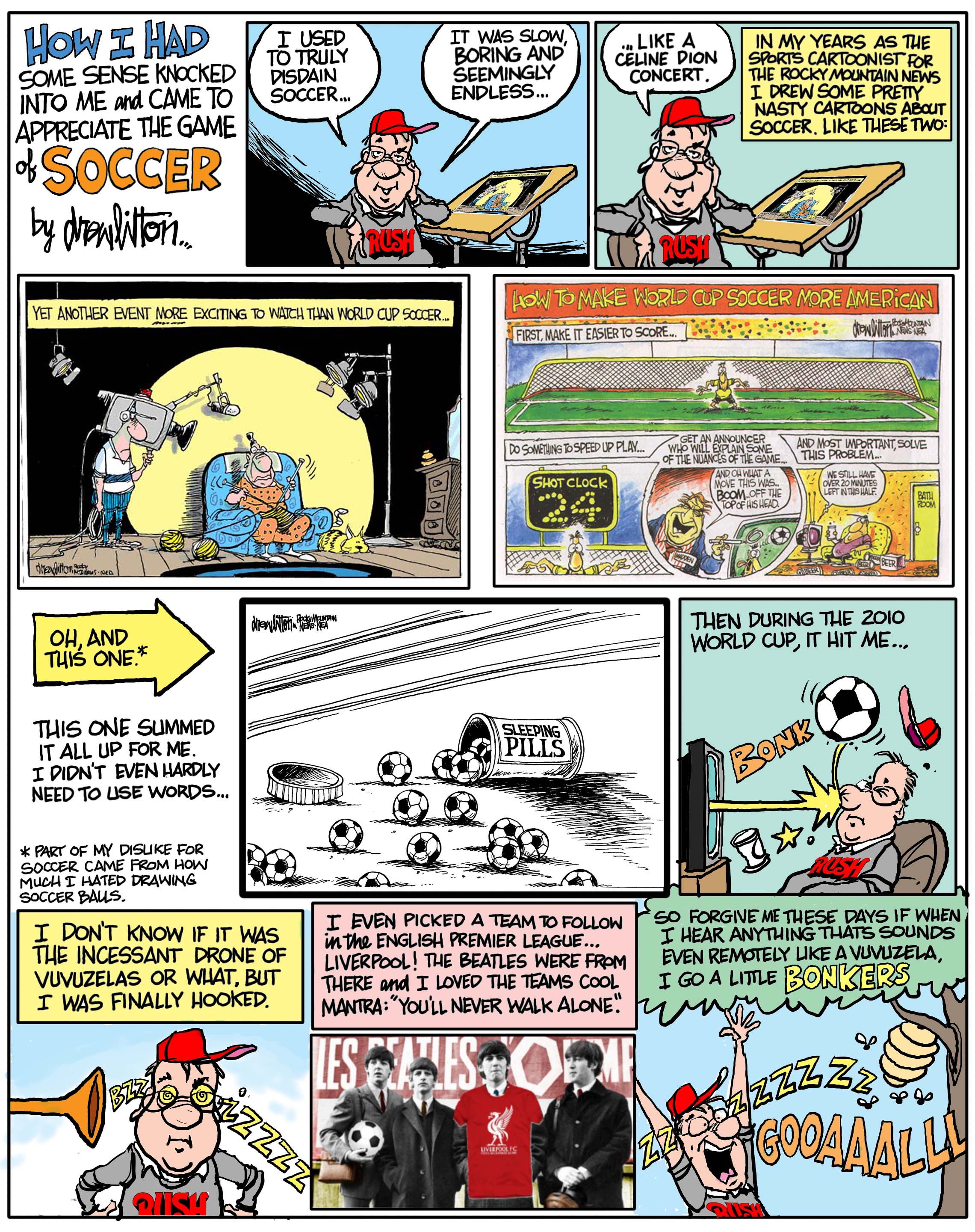 This is a cartoon I did for the March issue of Mile High Sports Magazine. I think it might be the first time I ever really did something auto-biographical. And it was great fun. I might try to do a few more like this in the future. It was a blast to revisit some of my favorite soccer toons that I did during my years at the Rocky and then talk about my transformation into a soccer geek. Well, calling myself a soccer geek might be exaggerating it a bit, but at least I can now watch the games without falling asleep. That’s real progress people! As they say in Liverpool and I paraphrase, thanks to all of you “I Never Draw Alone”!!!!