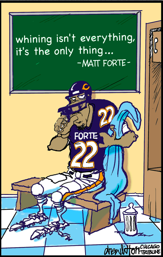 I have not heard about any whining. the back ground I remember is Forte giving 120% for a bears team that was asking him to wait until the end of the season to start negotiating his new contact. He had a record year going before he blew up his knee toward the end the season. All of his friends were telling him to slow down, take it easy as the bears were not going anywhere, and then after signing a big contract, like with seattle or someplace.