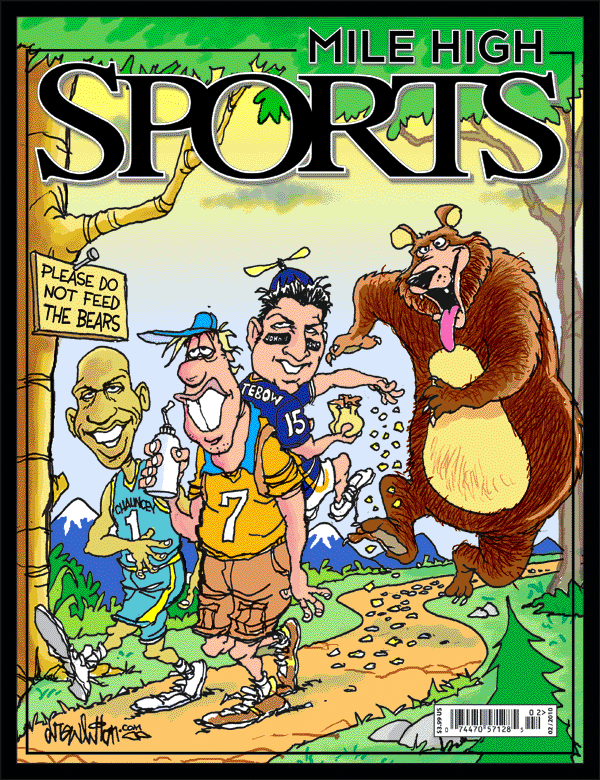 Jon. It’s a cover illustration for their issue on Outdoor activities in Colorado. Tebow is dropping food along the way to attract the bear with out Elway or Chauncey knowing about it.