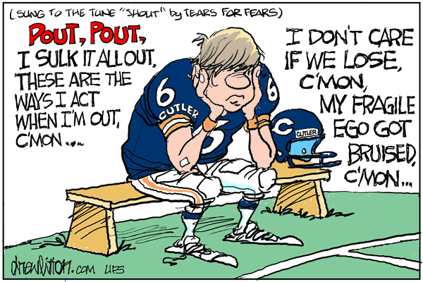 I don’t see this toon as criticizing the injury. I see it as criticizing Jay for not being a teammate and just sitting and sulking on the bench. It was really telling when Caleb Hanie was sitting on the bench studying the photographs and Jay just stared off in his own little world.