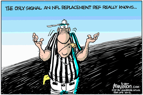 I’m not really sure why the “regular” professional refs are striking, and haven’t taken the time to do my research. It is clear that the league and ref’s association need to continue their negotiations. I will say, however, that I do feel bad for the replacement refs, a little bit, anyway. They have been thrown into a difficult situation. State high school and college game rules and regs, are much different than NFL rules and regulations. While there is, I would guess, a certain expectation that the replacement refs would be tested on their knowledge of the professional game – there has to be something said for “being in the heat of the moment.” I give them credit. I don’t know that I could stand on the sideline, in the end zone, behind the offense or defense, at a professional football game – with a whistle in my mouth. Knowing that I could potentially be taken out by a 300-pound lineman. I’d probably choke on my whistle. I wish them all the luck in the world, for however long they will be calling professional games this season, and pray that they will remain unbiased, focused, and diplomatic in their judgement calls.