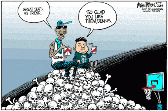 1. Numbskull, dumba–, whatever the adjective, it fits! I don’t know what is worse, Rodman’s mealy-mouthed efforts to avoid the morality of his actions, or that he now possesses the most first-hand information about Kim Jong Un than any person in the US Government.