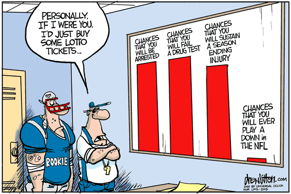 The really rough part for NFL Prospects is that it’s an all-or-nothing venture. If a baseball player can’t crack into the Majors, he can usually make a good run in the minors happen. Basketball and soccer players who come up short have a variety of teams around the world that might be interested. Hockey players, a little of both. But aside from the Arena League (shaky and very few spots) or Canada (Almost a completely different game: For instance, Tebow would fare even WORSE in the CFL than here), there’s not many fallback positions for NFL players looking for a second or third shot.