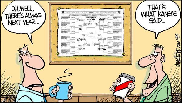 That’s what Kansas said. I have nothing against Kansas. I know a few Jayhawks. They are generally nice, tax paying citizens. But it seems like every year (yeah I know, they won in 2008) they end up always short. I though it was just a Roy Williams thing (yeah I know, he FINALLY won in 2005). But apparently not. So rant away on Kansas or the tournament or anything else. I have a fun cartoon posting over on ESPN.com later today and I’m going to give you a sneak peek at some new stuff going in my Zazzle Store sometime later today or in the morning.
