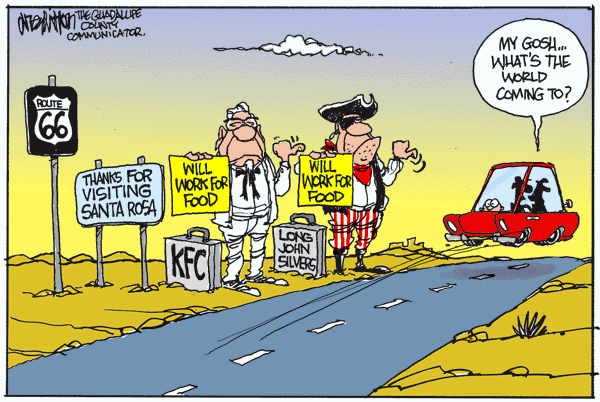 Some of you know that along with ESPN.com and the Chicago Tribune I also draw cartoons for the Guadalupe County Communicator in Santa Rosa, New Mexico. Their economy, like everyone’s across America, has experienced downturn. This week the local KFC/Long John Silvers restaurants closed their doors, which in a small community like Santa Rosa is a very big story. So this is the cartoon I did for today’s issue. A big tip of the ball cap to Mr. M.E. Sprengelmeyer, publisher of the Communicator.